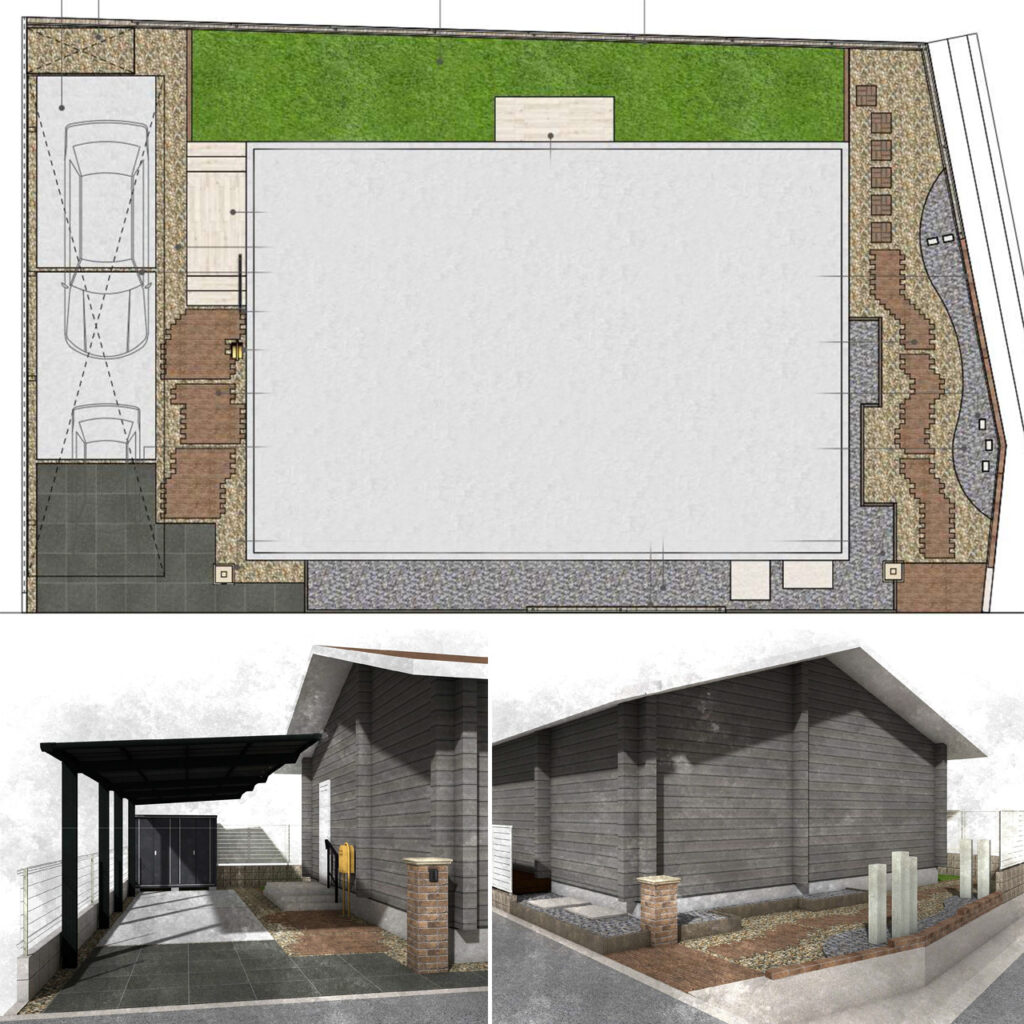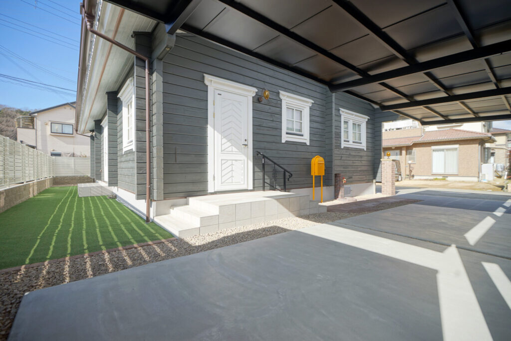 - 建物の外壁は濃いグレーへ塗装される予定だったため、カーポートや駐車場前は黒系で統一。