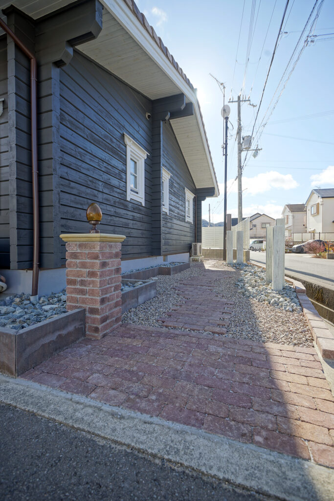 - ファサードは レンガ敷き調のアプローチとレンガ積み調の門柱 で洋風の可愛らしさを演出。