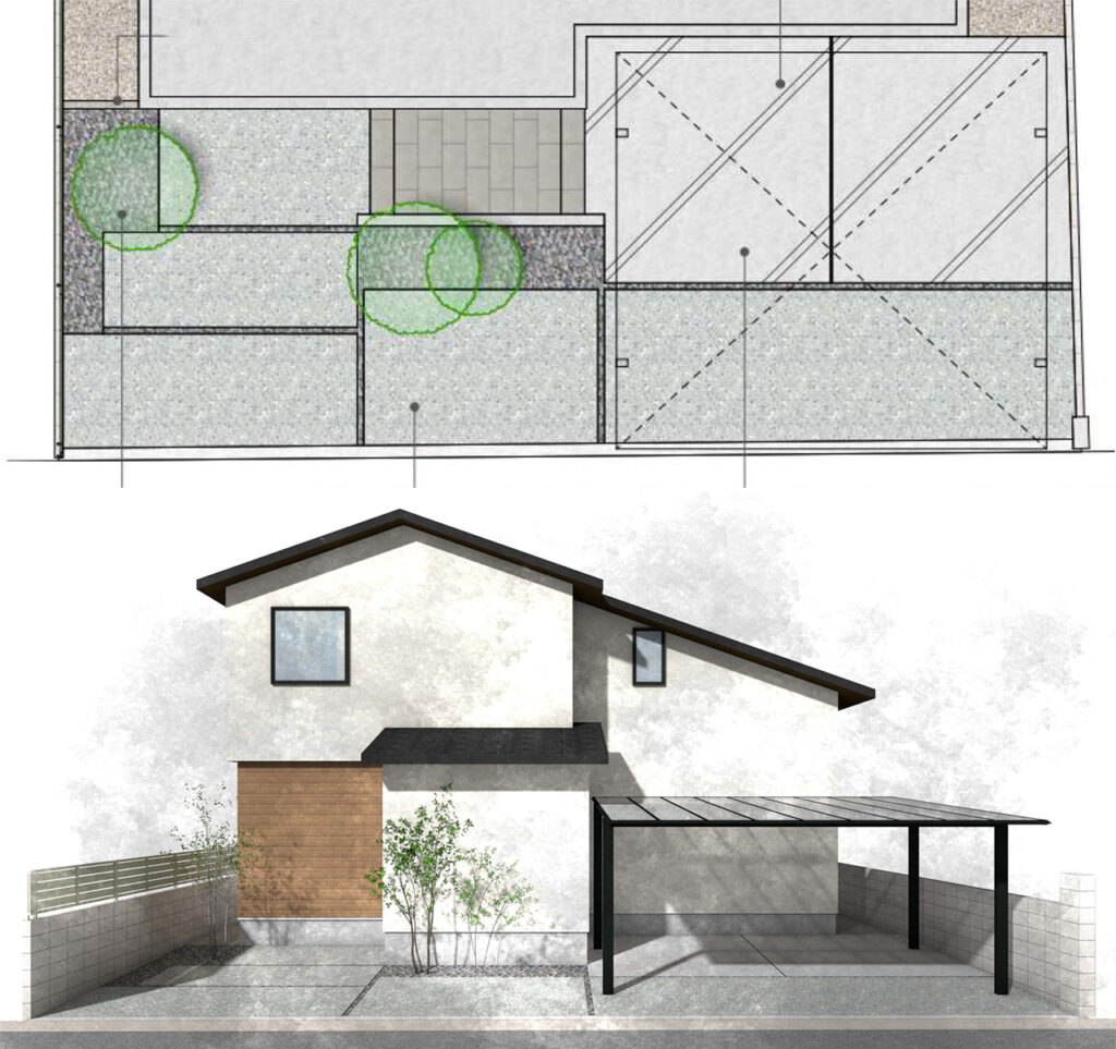 駐車場・アプローチ・裏庭テラスをトータルでデザインすることで、ナチュラルで落ち着いた雰囲気と、暮らしやすさを兼ね備えた外構空間 が完成しています。