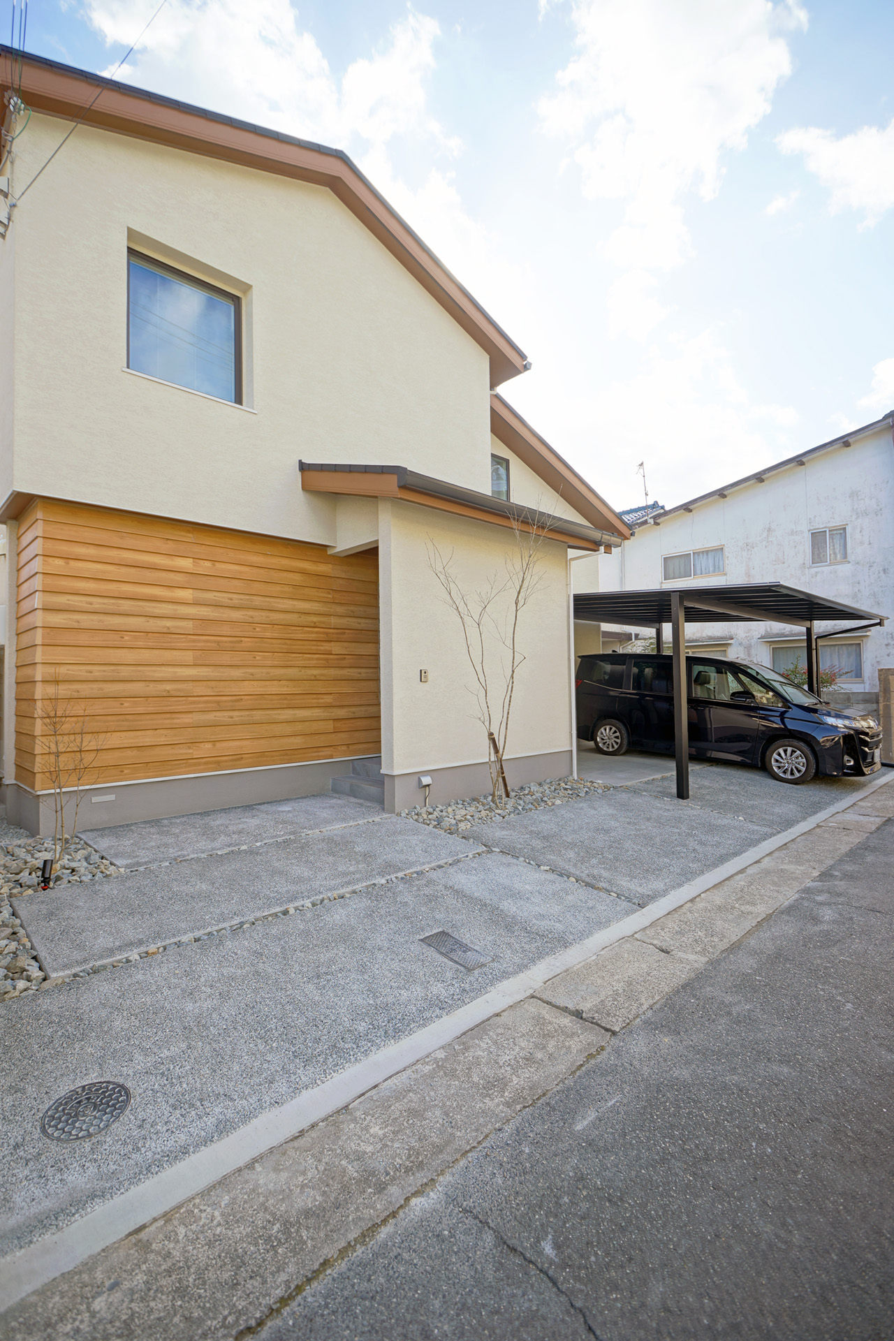 - 駐車場とアプローチは洗い出し仕上げとし、シンプルながら質感のある仕上がり となりました。