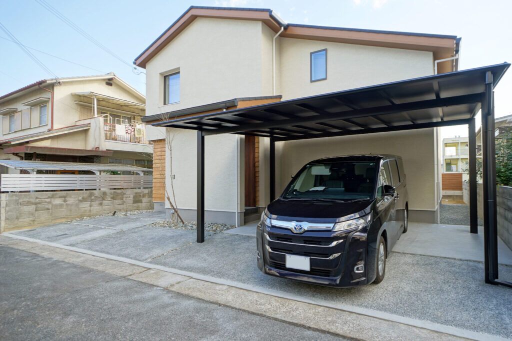 - 駐車場2台分には 黒いフレーム+ブラックポリカ屋根のカーポート を設置。