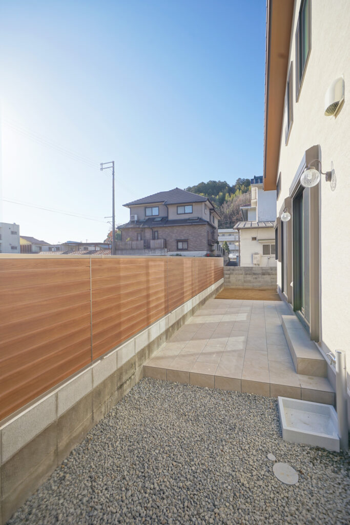 - 裏庭は ウッド調のアルミフェンス で目隠しをしつつ、リビング前に広いタイルテラスとステップを設置。