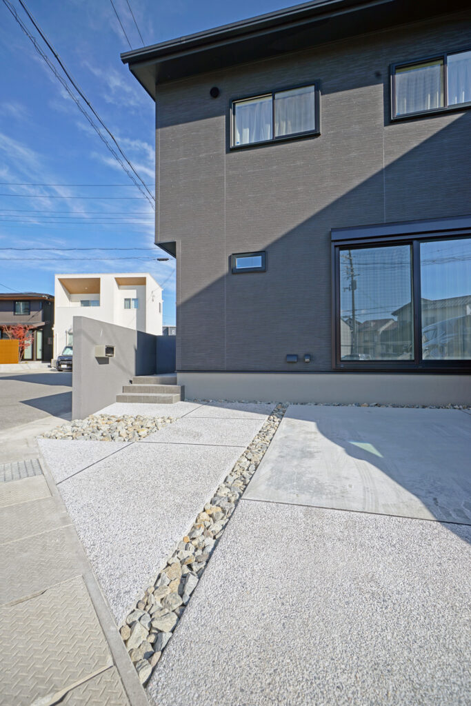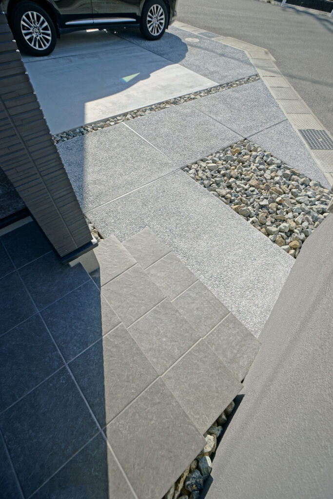 外構全体を明るいグレー調のモノトーンで統一。割栗石のスリットを広めに取ることで、無駄のないシンプルモダンなデザイン に仕上がりました。