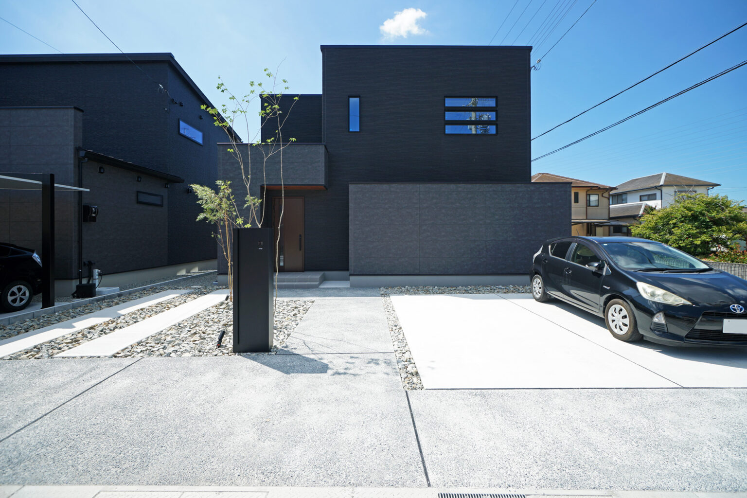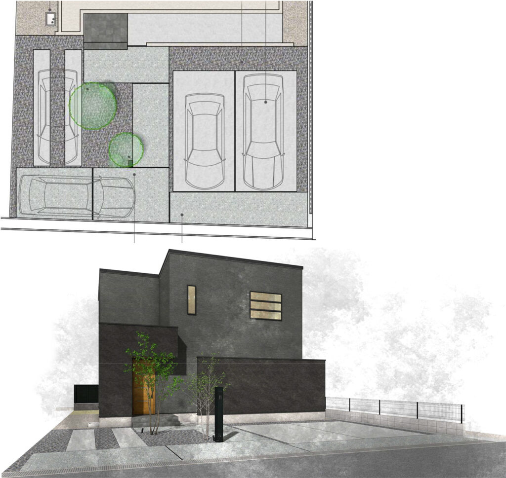 「黒い外壁に合うシンプルで洗練された外構デザイン」「駐車スペースの確保」「プライベートを守れるテラス空間」が大きなご要望でした。
