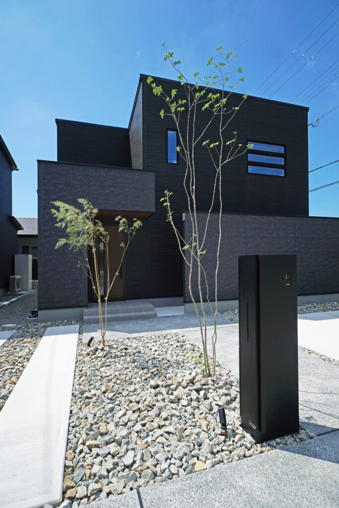 黒い外壁とコーディネートした外構は、直線的でシンプルなラインを基調とし、黒い機能門柱と植栽の緑のコントラストが印象的。