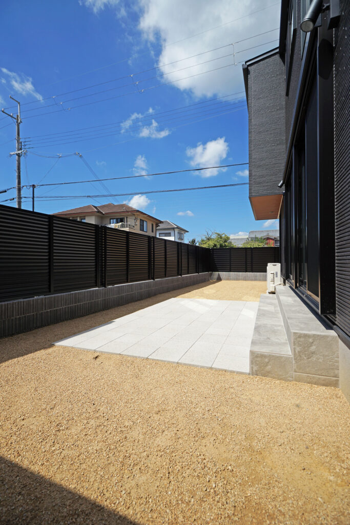 • 周囲は 化粧ブロック+目隠しアルミフェンス で囲い、プライバシーを確保。黒いフェンスが空間をモダンに引き締めています。