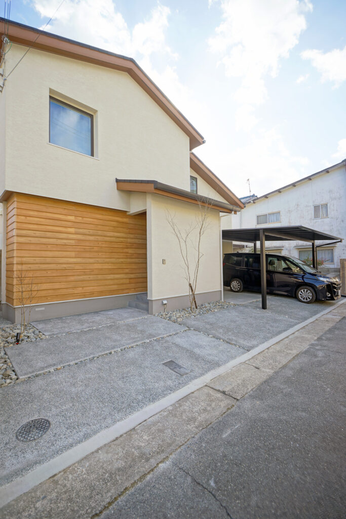 濃いめのグレー基調の門柱に対して、アオダモの明るい葉がよく映えます。